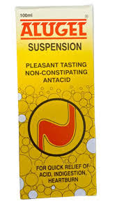 Alugel suspension (100ml) is an antacid containing magnesium aluminosilicate (or similar aluminum hydroxide compound) and simethicone, used to relieve indigestion, heartburn, and gas by neutralizing stomach acid.